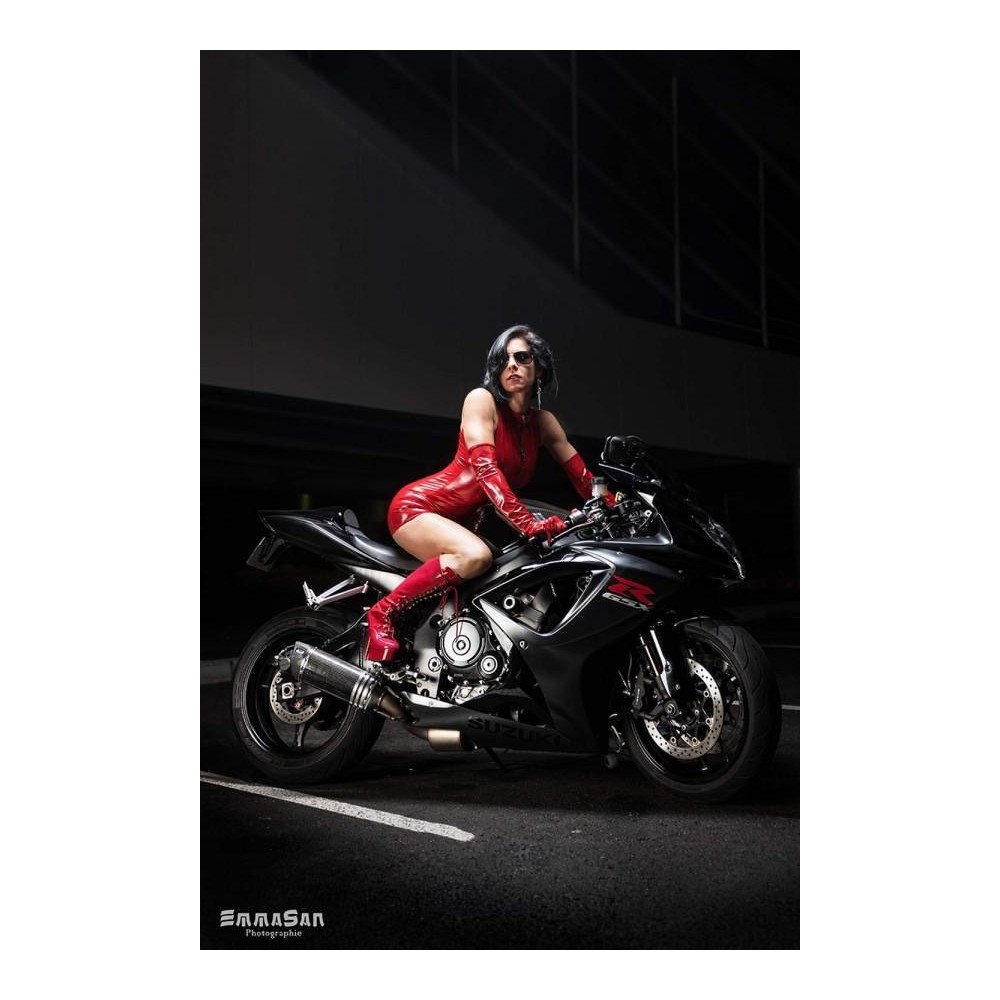 Combishort en vinyle rouge brillant sans manches à petit col montant. Zip central du col jusque sur le haut des fesses en passant par l'entrejambe. 3 curseurs qui permettent de jouer sur les ouvertures. Composition : 80% polyester - 12% polyuréthane - 8% élasthanne