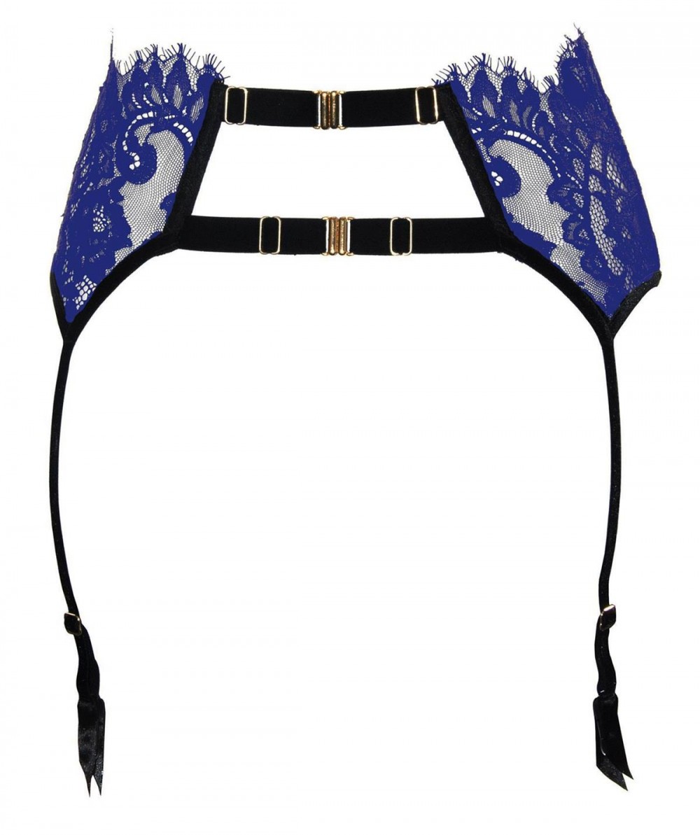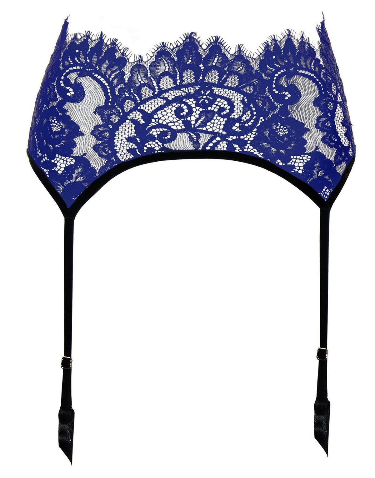Labelia kousenband gemaakt van levendig kant, versierd met fluwelen tape. Door de ingenaaide botten kan het de vorm van het lichaam perfect volgen. Bevestigt aan haken van achteren. Verstelbare koushouders