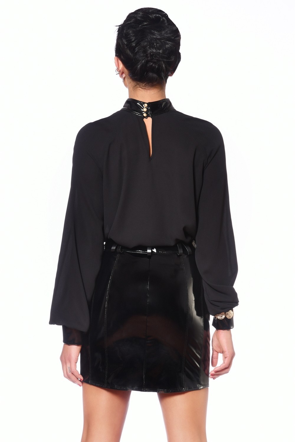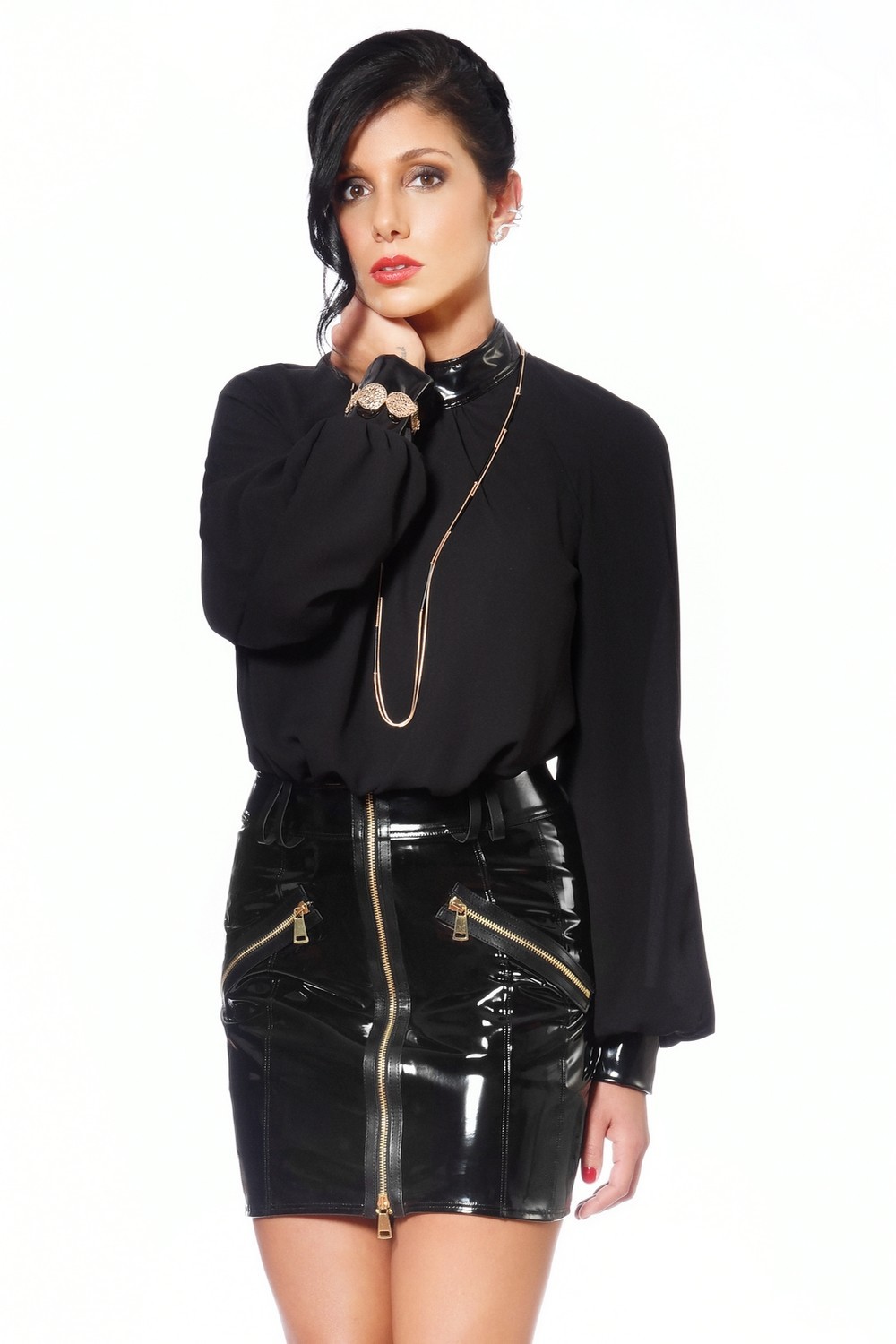 Mini saia sexy em vinil preto brilhante. Abertura total no centro à frente com fecho de correr que abre na parte inferior. Presilhas de cinto na cintura. Dois bolsos falsos nas laterais decorados com fechos dourados.